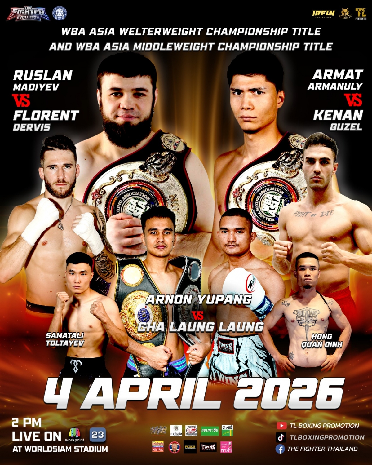 WBA ASIA Double header in Bangkok on April 4. WBA no.10, Ruslan Madiyev will have his defense match against Florent Dervis for WBA ASIA Welterweight title.